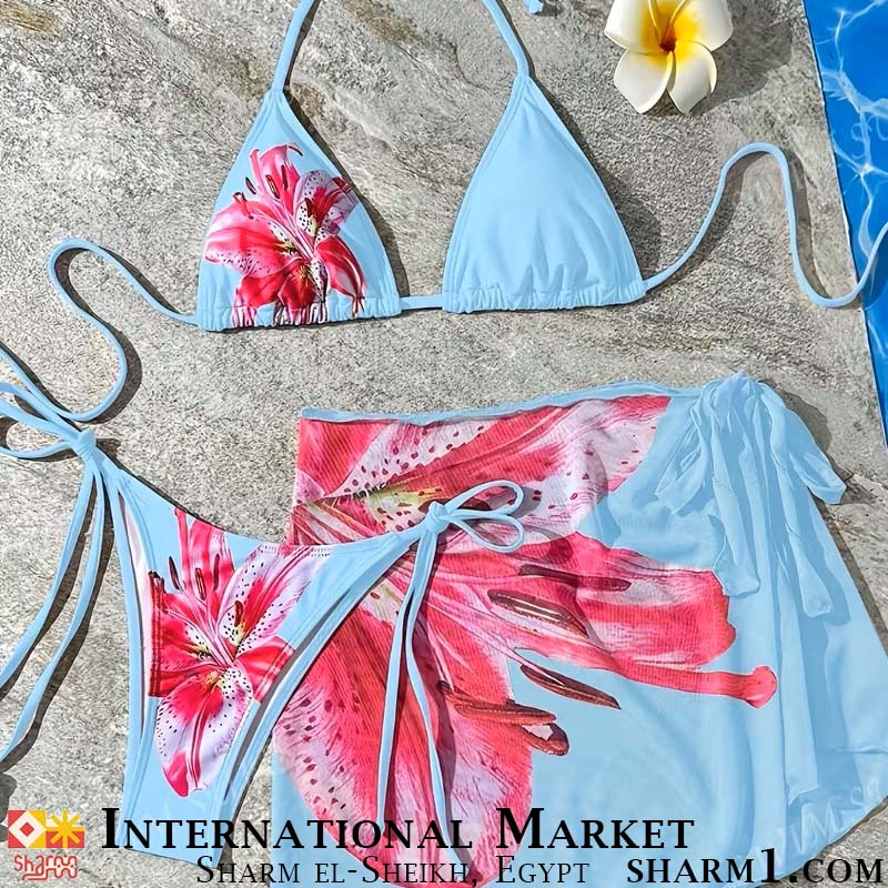 Набор для пляжа небесный купальник и юбка с цветами