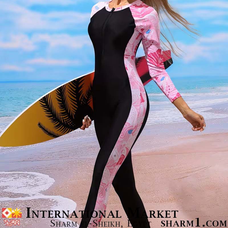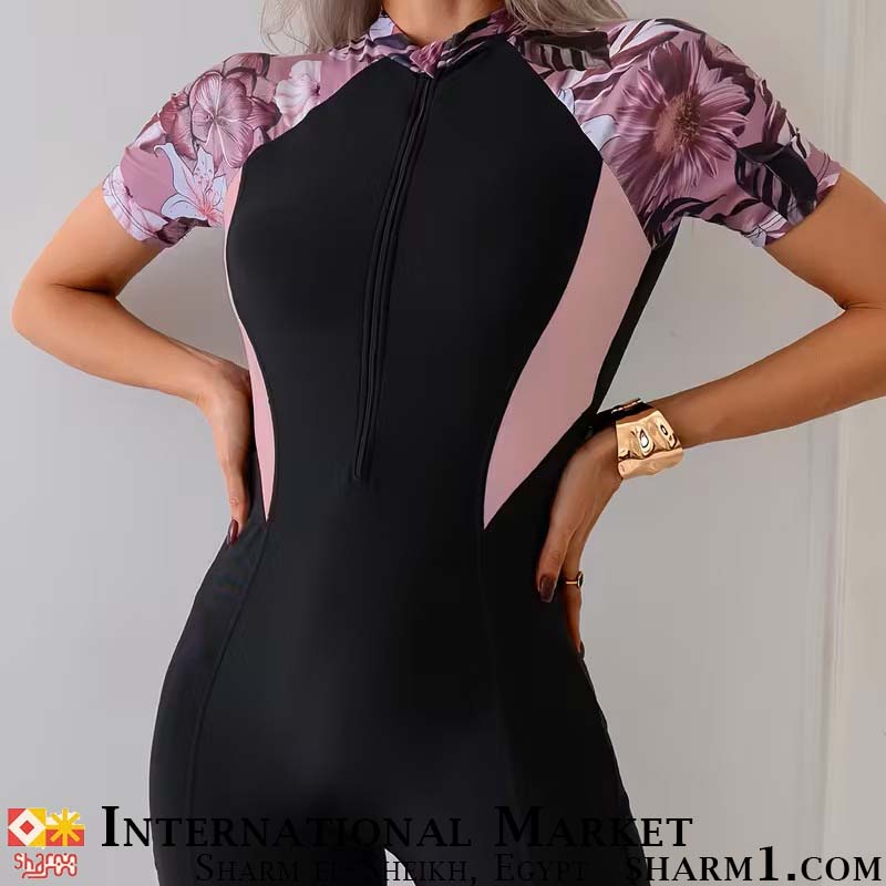 Закрытый купальник с розовыми вставками и цветами