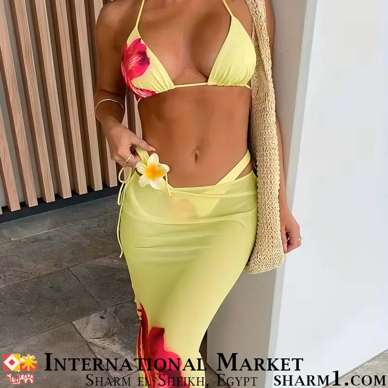Набор для пляжа желтый купальник и юбка с цветами