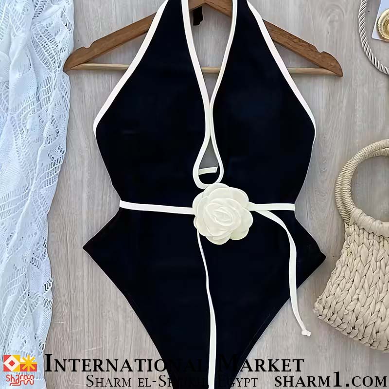 Слитный купальник черный с белым цветком